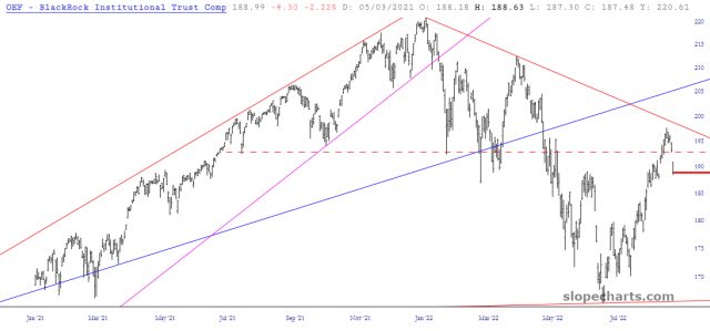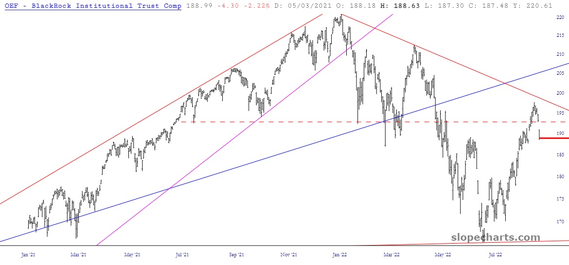 OEF – the S&P 100 ETF reached for, but failed to meet, its resistance trendline.