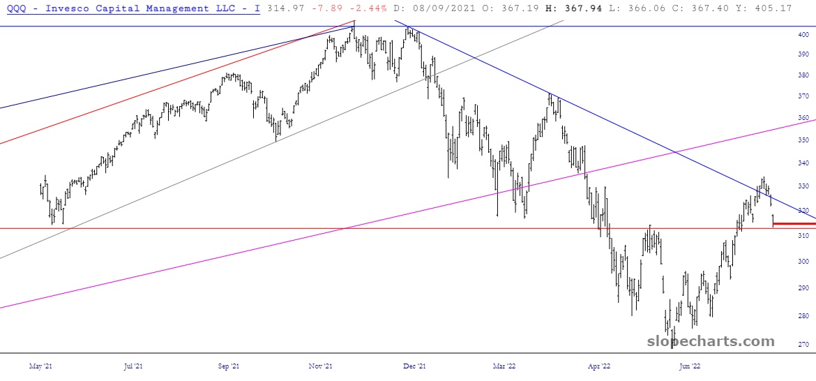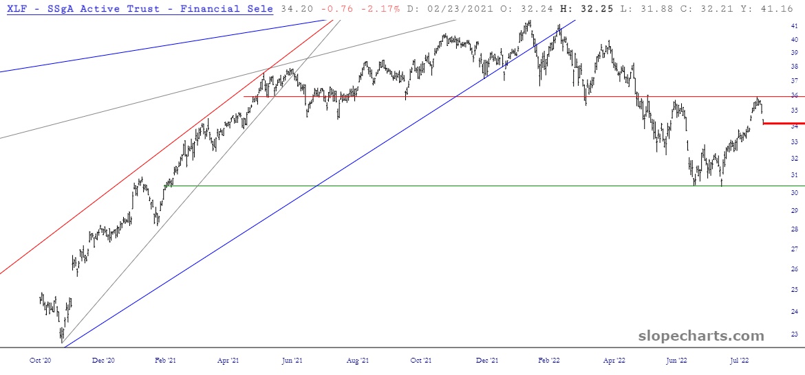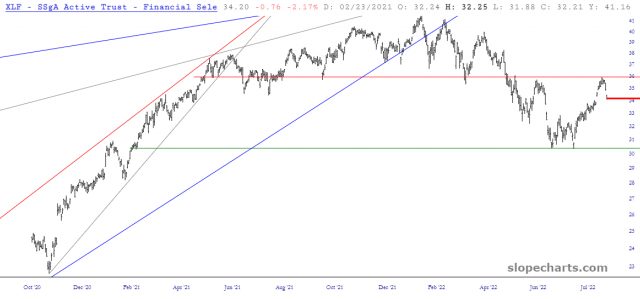XLF – financial stocks topped out nicely and are turning away from the same early June resistance