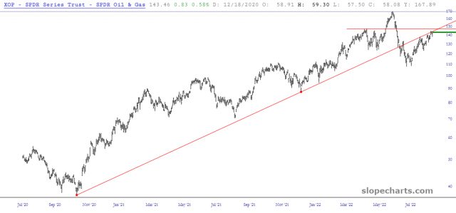 XOP – oil stocks are being torn between, on the one hand, a potential Iran deal (bad for oil prices) and, on the other, Saudi jaw-boning about cutting back supply (good for oil prices). From a charting perspective, it’s getting pretty close to a make-or-break point for the bears, since one more strong day would cause real harm to this setup.