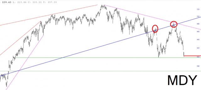 This year has been an embarrassment of riches when it comes to beautiful charts. Here is another one: the MIdCap 400 ETF symbol MDY. Take note of the two instances in which the trendline, formerly support, now resistance, did a beautifully job shoving prices right back down where they belong.