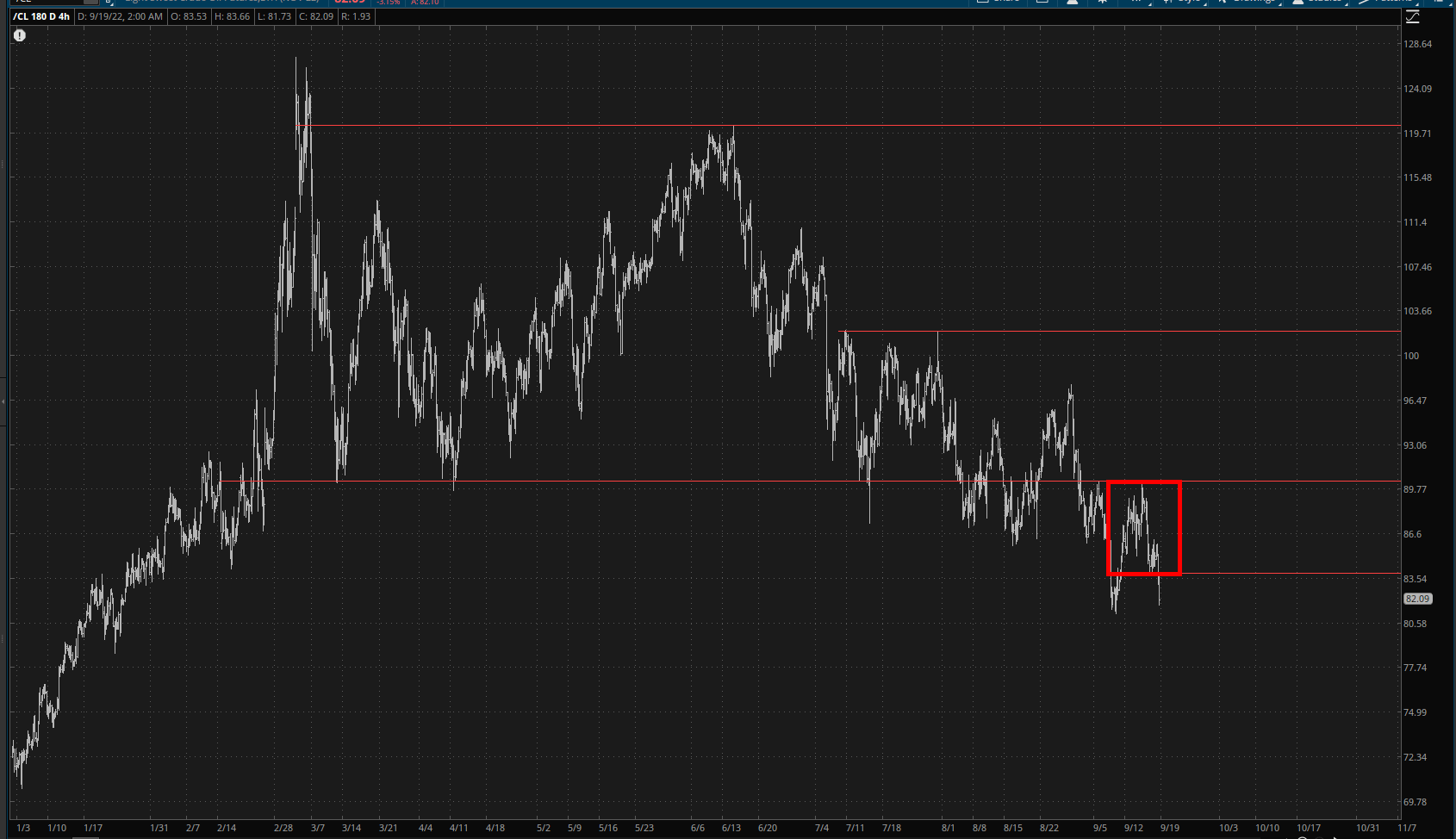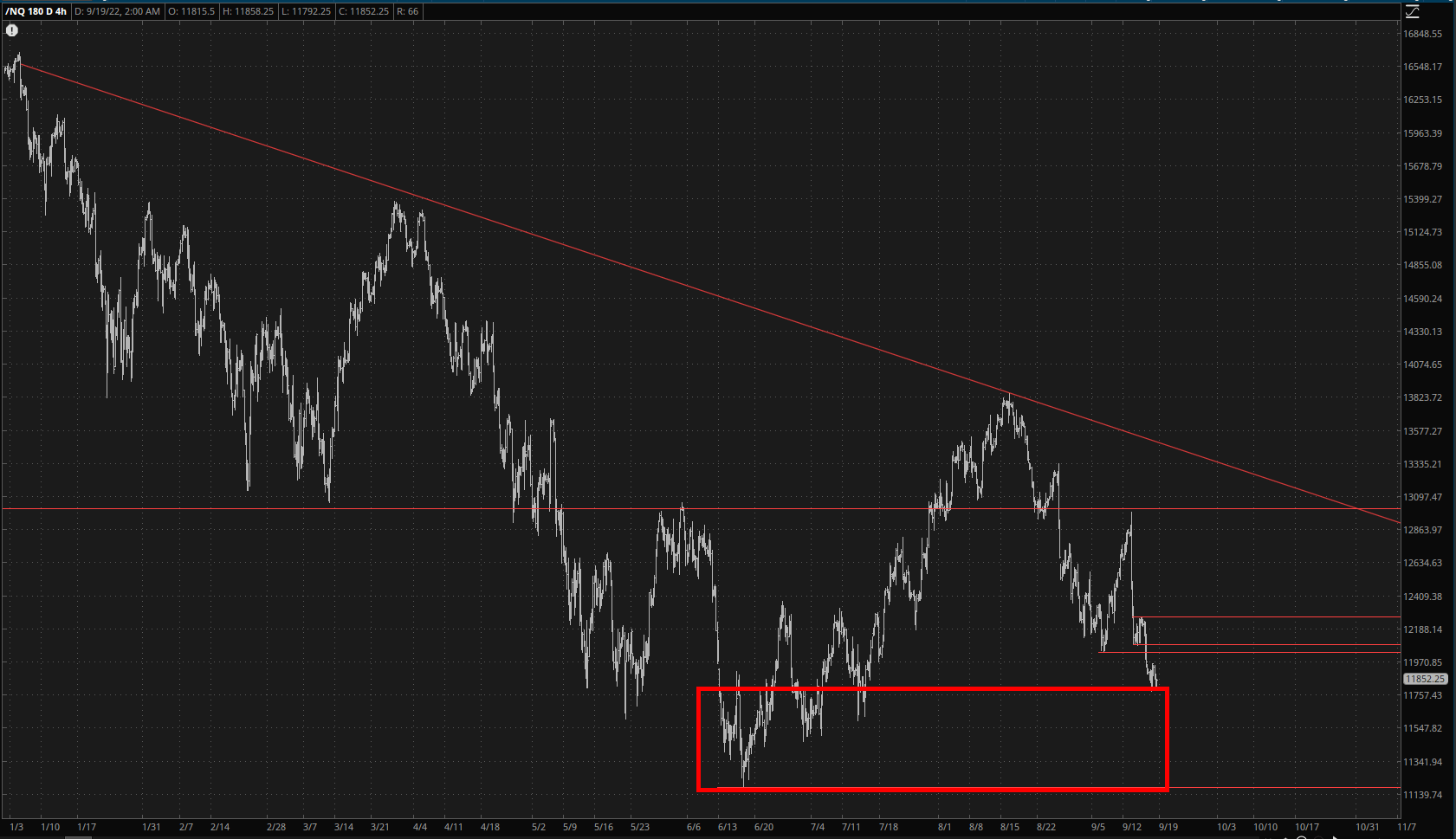 Looking at a much bigger picture, this time with the /NQ, you can see that it will be no easy task for the markets to simply melt right through the area I’ve highlighted. It’s either going to take a steady bleed-out, with “investors” getting increasingly nervous, or some oh-my-gard shock event to just outright lurch the thing lower. As my paying subscribers know, Friday marked a jaw-droppingly important point in the market which, regrettably, has equal opportunities for mega-rally as it does for wipeout. I’m positioned for the wipeout, naturally.