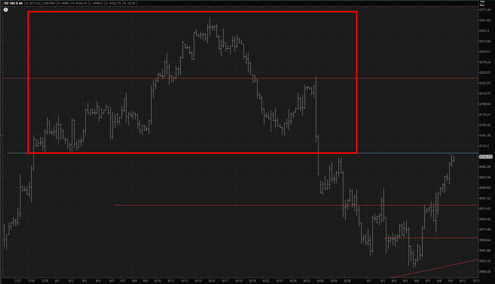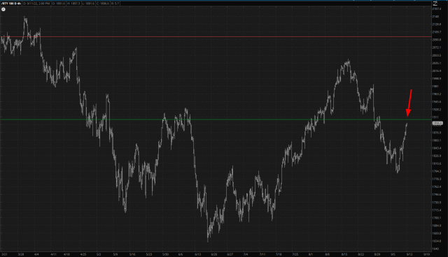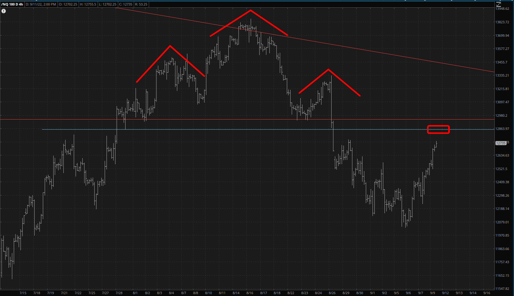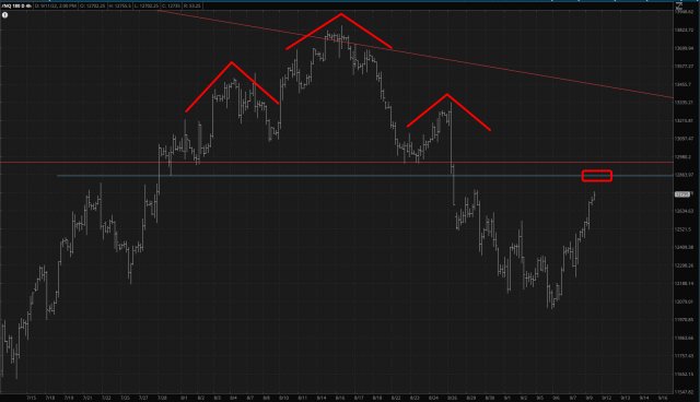 The cleanest topping pattern, by far, of the stock futures is the /NQ, which is why it’s the only one of these on which I have a position (long November QQQ puts, but not a big position). The market really needs to stop this assault fairly soon for the bears to have a fighting chance. Of course, we may just grind around and do nothing on Monday, due to the “All Eyes…..’ mentioned above.