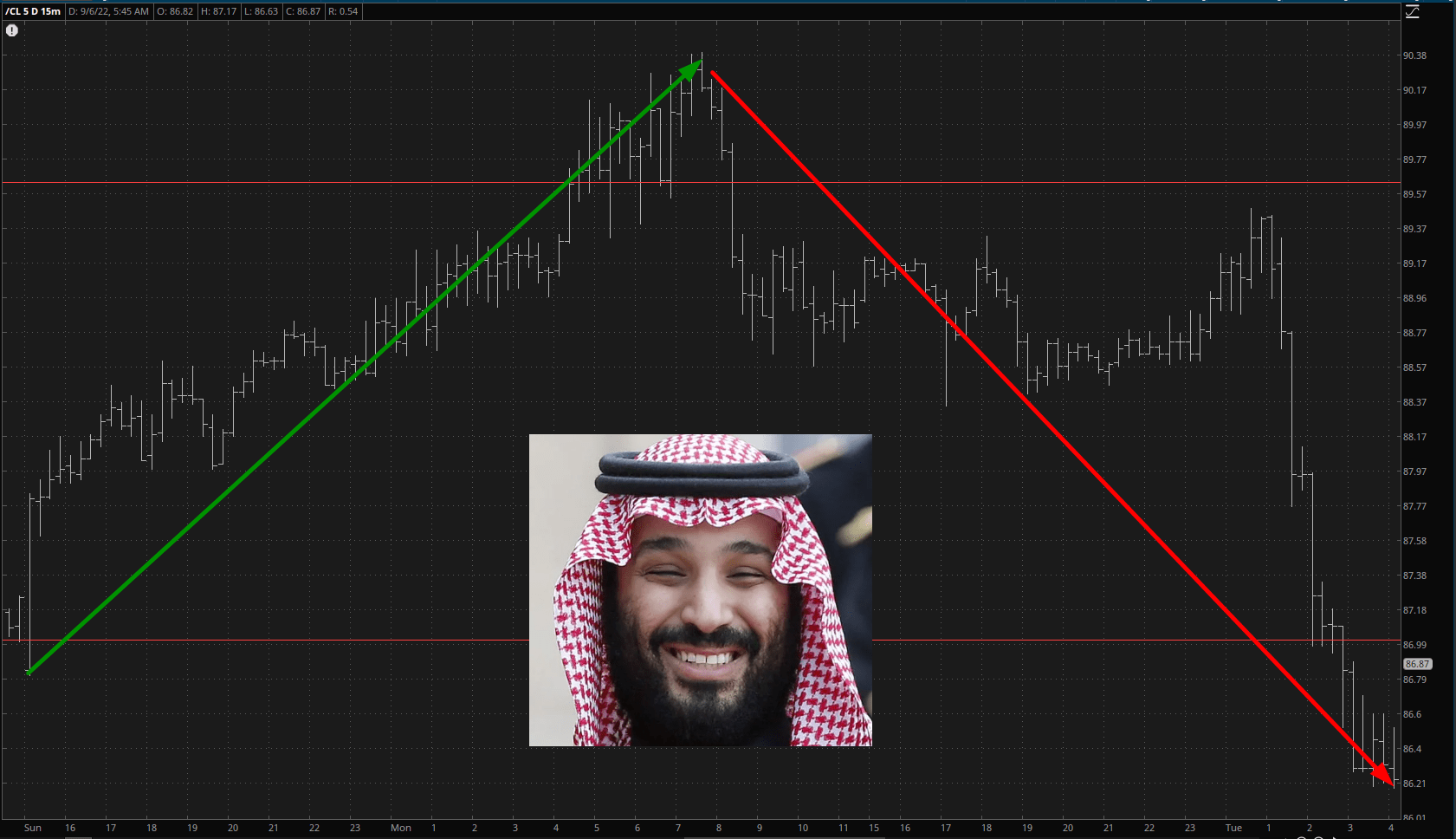 For me, the highlight over the weekend was what happened with crude oil, which (as my premium subscribers in particular know) I am super-bearish. You see, the nice people from Saudi Arabia announced that, in a world of exploding energy prices, what they were going to do is DECREASE production, which of course send oil prices even higher (green arrow). What’s cool is that energy is so doomed (in my estimation) that even the cynical cutting off of supplies by the lovely humanitarians known as the Saudis was insufficient to stop the selling from resuming.