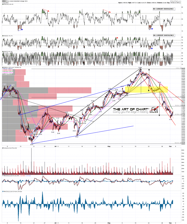 On the Dow chart the full H&S target was made yesterday, reaching the 61.8% retracement area. A decent looking falling wedge has formed on the way down and broke up yesterday afternoon. A possible declining resistance trendline target is now in the 32700 area and declining rapidly.