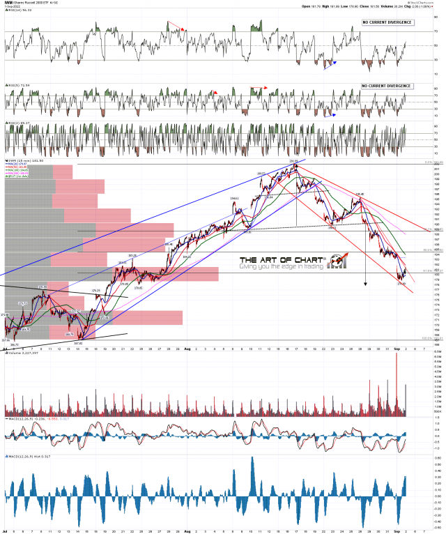 On the IWM chart the full H&S target was almost made yesterday, reaching the 61.8% retracement area. A decent looking falling wedge has formed on the way down and broke up yesterday afternoon. A possible declining resistance trendline target is now in the 191 area and declining rapidly.