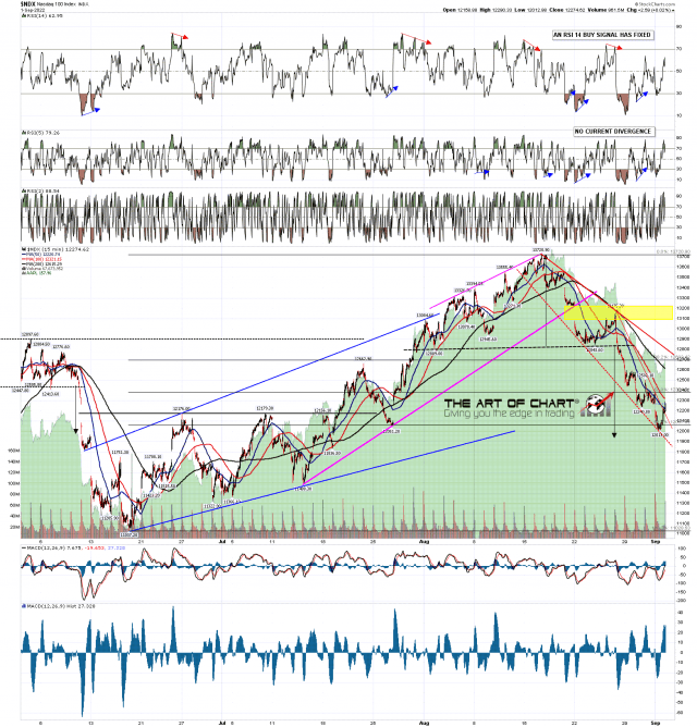 On the NDX chart the full H&S target was almost made yesterday, reaching the 61.8% retracement area. A decent looking falling wedge has formed on the way down and broke up yesterday afternoon. A possible declining resistance trendline target is now in the 12820 area and declining rapidly.