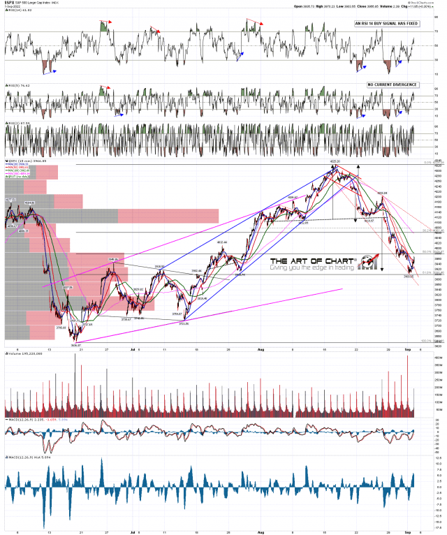 Either way I’m expecting to see at least a rally attempt here, and I think that rally started yesterday. On the bull scenario I would be leaning towards a 50% (approximately) retracement back towards the new SPX monthly pivot at 4078, possibly failing at the 50 hour MA, currently at 4053, then a retest of yesterday’s low to set up positive divergence on the daily chart and a double bottom setup to retest the rally high, and then the move back to that high at 4325.28, setting up a possible move back to retest the all time highs.