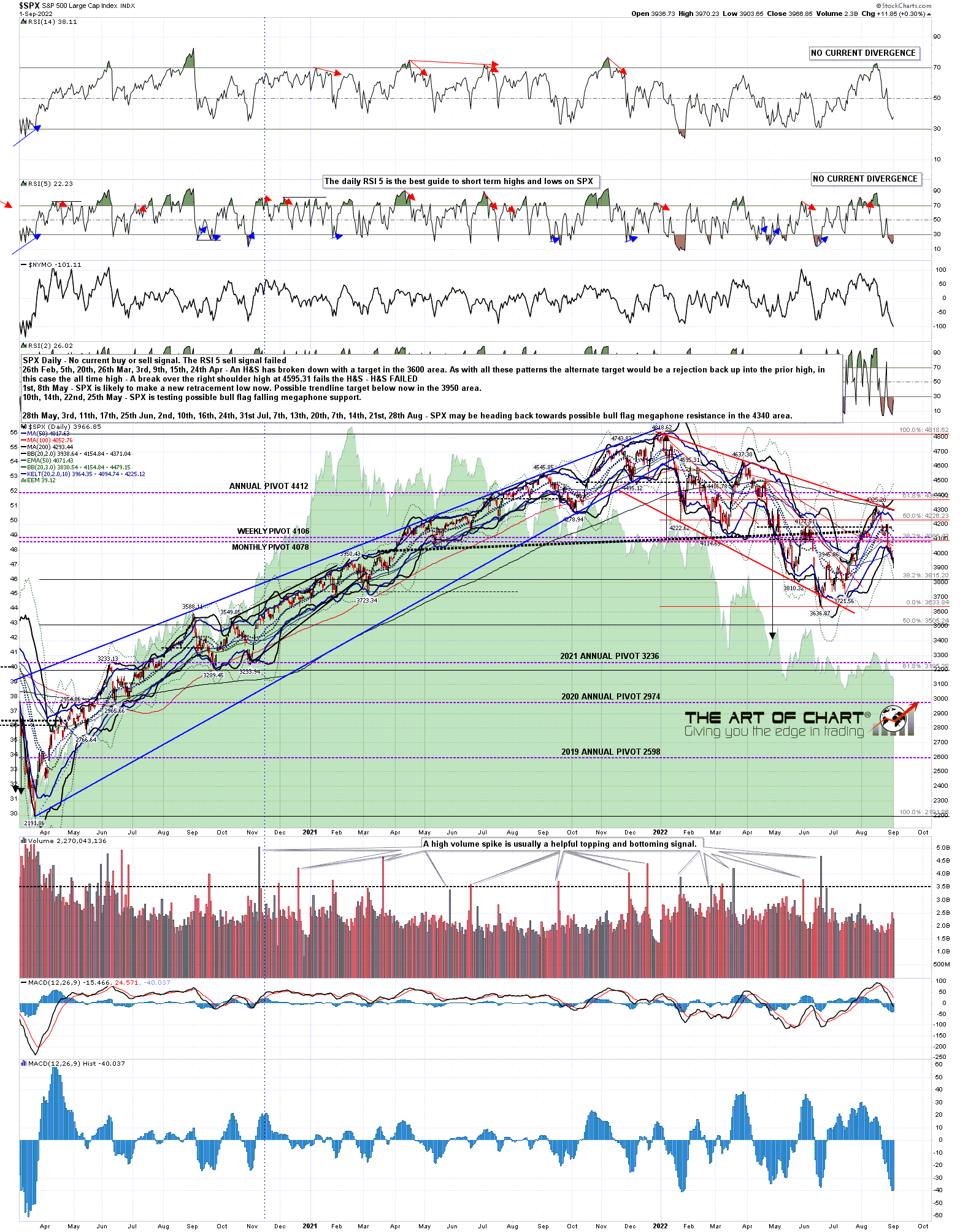 The H&S patterns from the rally highs that I was looking at a week ago all made their target areas yesterday and SPX is now testing important support at 3900. This area was significant on the way up in early 2021, and was then key support in May, resistance in June, and was broken as resistance and backtested as support in July. Bulls need to hold this area if they want to go higher, and bears need to break it hard if they want to retest the 2022 low at 3636.87 and go lower.