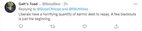 This is a poignant example of how divided our country is. The electricity to my house failed, and in response to this news, people pile on with an entire litany of how You Commies In Commifornia Deserve This And So Much More. It’s insane.