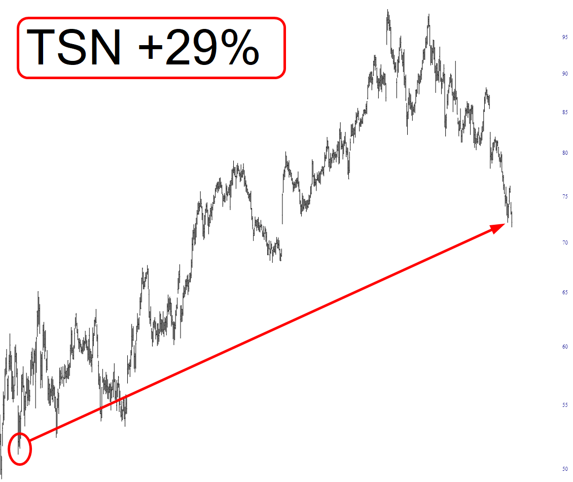 Here is Tyson. Now, this isn’t going to win any awards for the greatest stock of all time, but a gain is a gain, and 29%, particularly in the face of all the rough sledding this year, isn’t bad at all. So Tyson seems to be doing just fine.