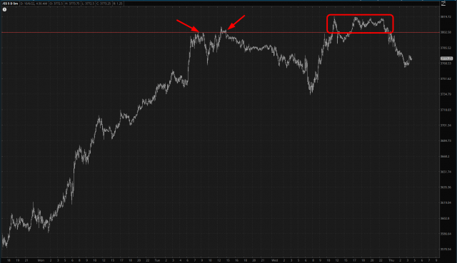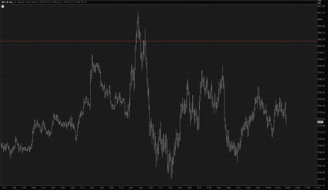 Good morning, everyone. Well after the disappointment on Monday (plunging Sunday futures followed by explosive green streak), on Tuesday (higher all day long), and Wednesday (plunging markets earlier, then an hour after the open, massive bull move higher), I am utterly skeptical of anything I see in front of me. As I type this, nearly two full hours before the opening bell, the entire screen is red, and it doesn’t mean a damned thing. I will only note that, in recent days, the 3802 level on the /ES remains sorta-kinda decent resistance.