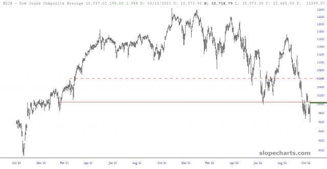 Here is the daily chart of the Dow Composite for the past couple of years. There was a pronounced gap (as with most markets) last week which was sealed during Thursday’s mega-rally.