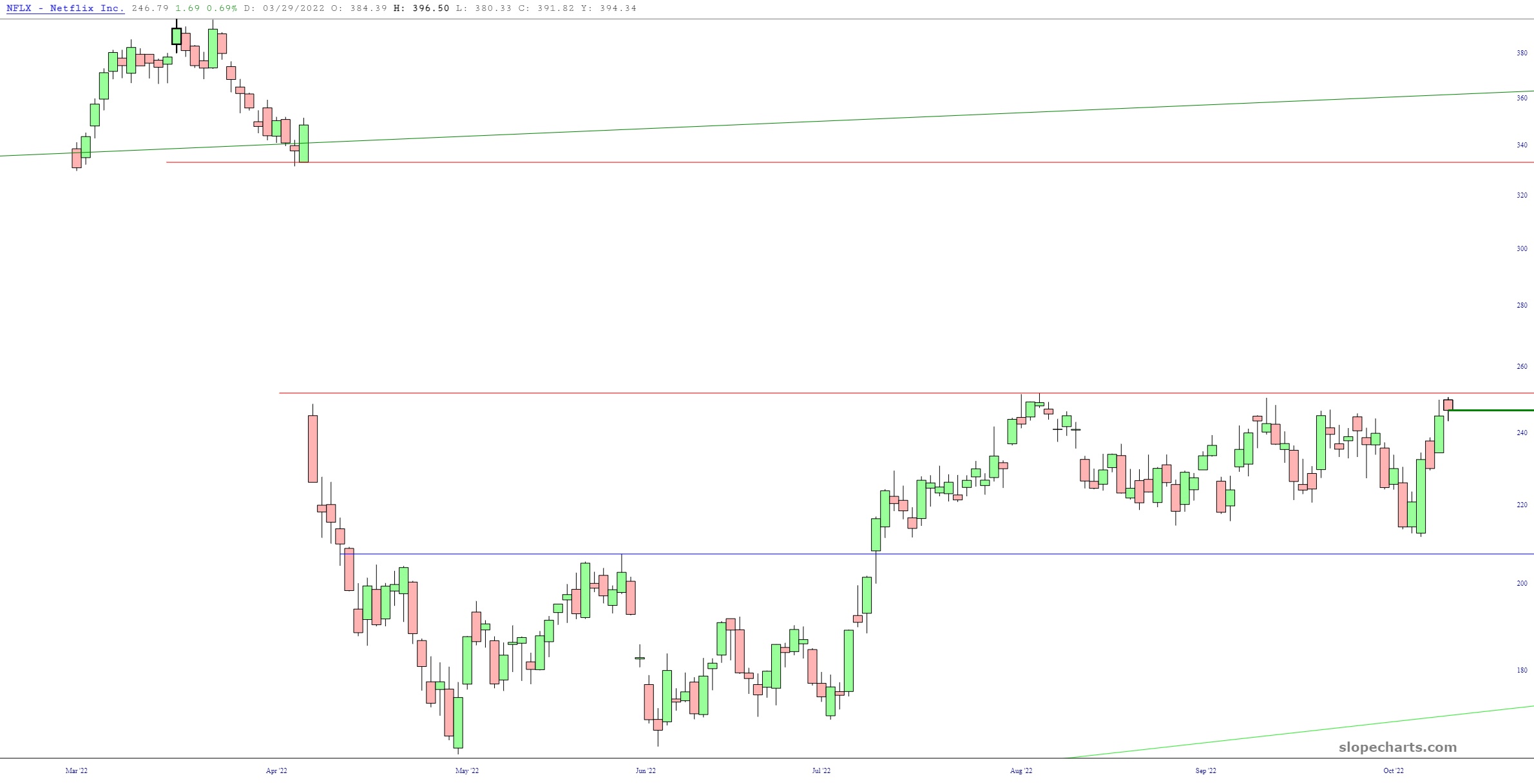 Since I’m surrounded by bulls these days, I thought I’d share a couple of prospective long positions. The first is fallen angel Netflix (NFLX) which, should it push above its horizontal at $252, seems well-positioned for a potential gap-fill:
