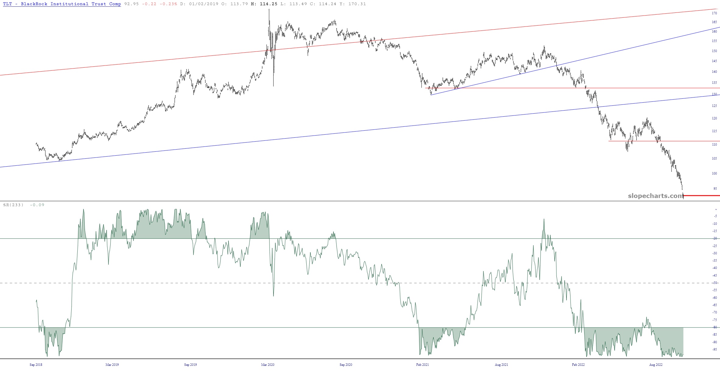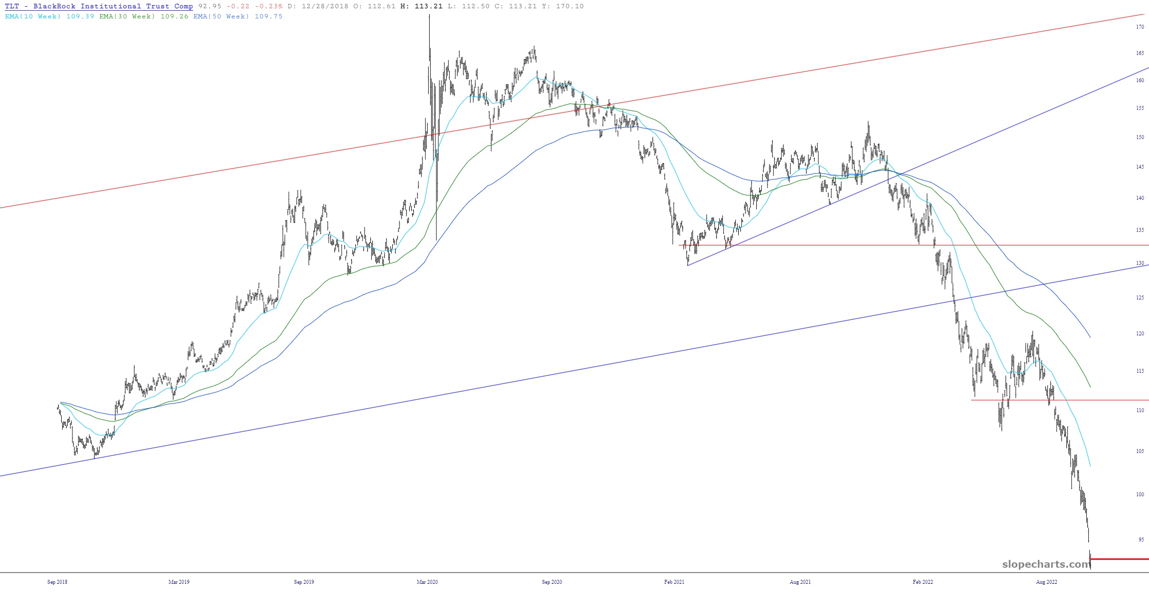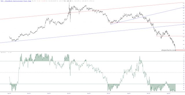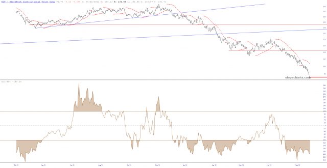 My premium users have always had access to my published watchlists, and two of them show which positions I am long (X-Longs) and short (X-Shorts). The latter one is always chock full of goodness, but the former one usually has tumbleweeds blowing through it and the distant sound of crows cawing. Now, for the first time since Mamie Eisenhower was touring the U.S., it actually has a symbol: TLT. These are, of course, the bonds, and in spite of the risk of “catching a falling knife“, I’m giving this one a shot.