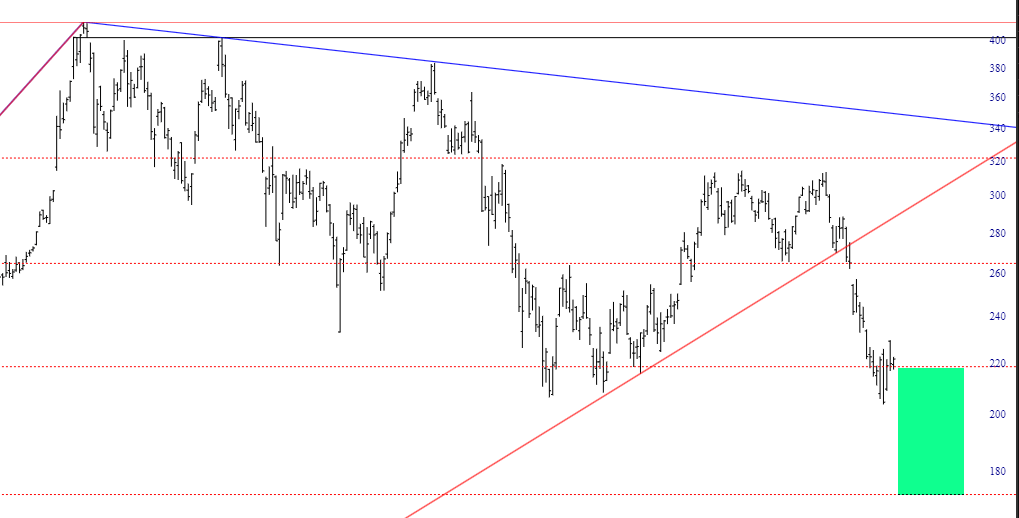 If the stock ultimately gets below $200, that does two bad things for it. One, it breaks a psychologically-important Big Round Number, and two, it untethers the price from that Fibonacci level I’ve mentioned so many times and introduces the prospect of a trip to around $175 or so. Not a crash, but still, another “stair step down” is what has been a very steady demolition of the stock. I mean, let’s face it, even right now, the stock has already lost 50% of its value.