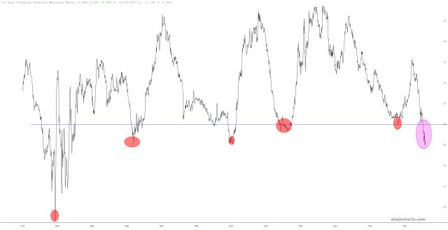 I was also struck by the “ten minus two” interest rate chart, showing the inversion of yields over many years. As you can see, rates are more severely inverted now than they have been in nearly half a century. Let’s just say anyone doesn’t think a massive recession is on the way is smoking dope.