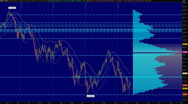 Finally, let’s take a look at /RTY. As the small cap index, it can give good clues of market liquidity if a trend is changing. We are not seeing a trend change in /RTY yet. There is a nice clean cluster of two POCs at 1783 on the small caps. This level is probably the best stop I see to use for a change in market direction over the short term. I remain bearish under that level.