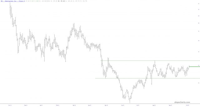 The other is Sweetgreen (SG) – a chain of salad restaurants – which likewise looks like a potential breakout if it pushes above 21.66: