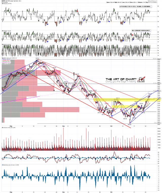 In terms of retracement targets an obvious target on any decent retracement is the hourly 50 MA, currently at 3756. If a topping pattern forms here along the lines I was looking at above, that would be a decent match with the target.