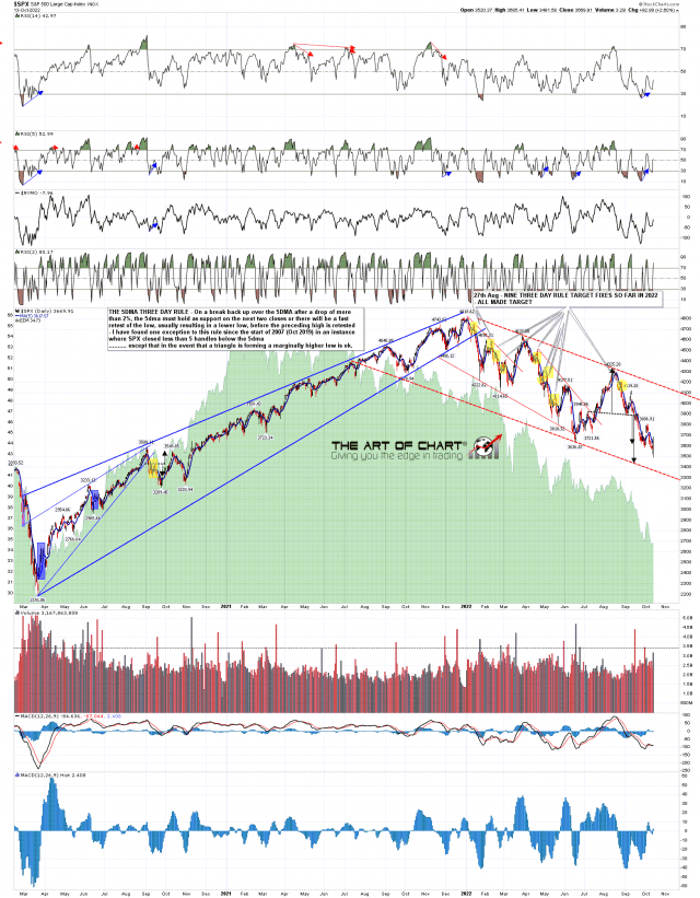 SPX closed back over the 5dma yesterday, currently at 3617, so SPX is back on the Three Day Rule. If there is a close back below that today or Monday of at least five handles below, then we will very likely see a retest of yesterday’s low at 3491.58 before a retest of the last rally high at 3806.91. On the current basis of calculation (after a small tweak in 2019), this rule has fixed and made target well over a hundred times since the start of 2007 without a single fail apart from two very near misses when a triangle was forming at the low.