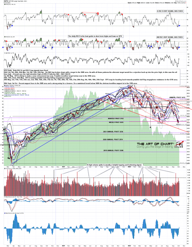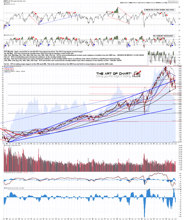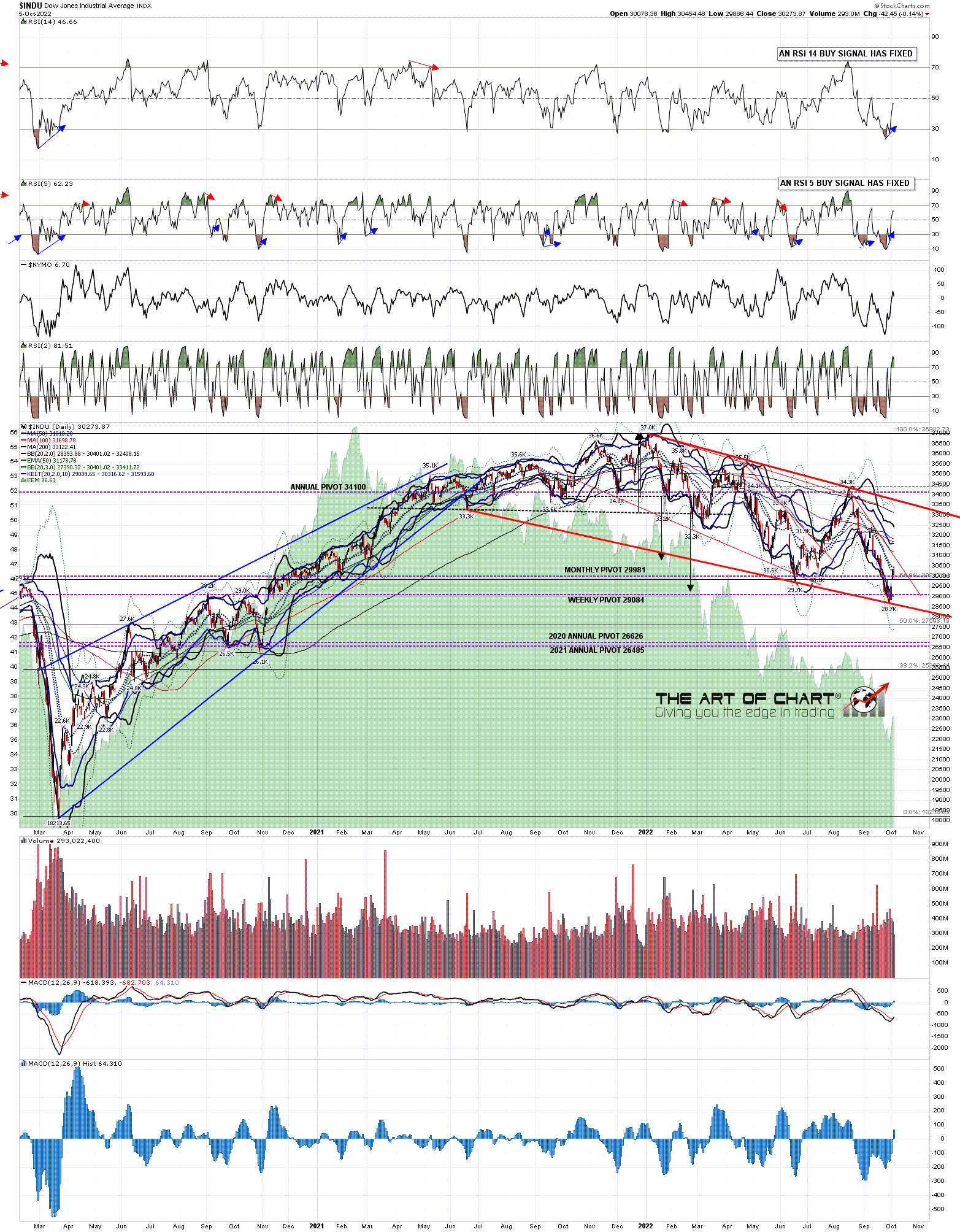 There are a couple of things worth noting from the Dow daily chart. The first is that the daily RSI 14 buy signal that just fixed is the first one since the 2020 low, which is at the least encouraging for surviving bulls.