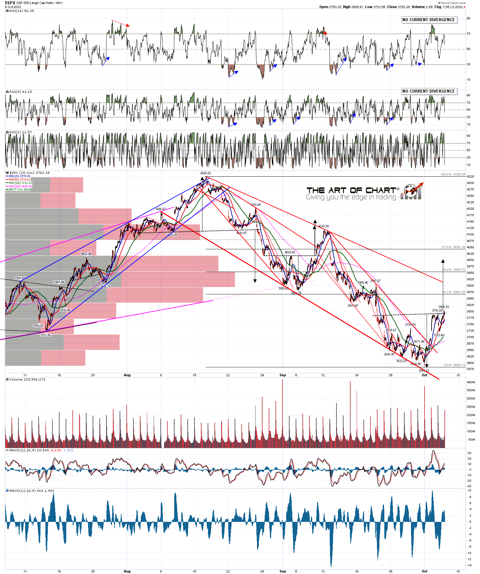 Why is this a possible hard fail setup? When a pattern like this breaks up, then then one of two things is very likely to happen. The first is that the pattern makes target, and the second is that the pattern fails, rejecting back into a retest of the prior low. If SPX breaks back below yesterday’s IHS right shoulder low at 3722.66 then the IHS will have failed and that will fix a target back at the prior low at 3584.13.