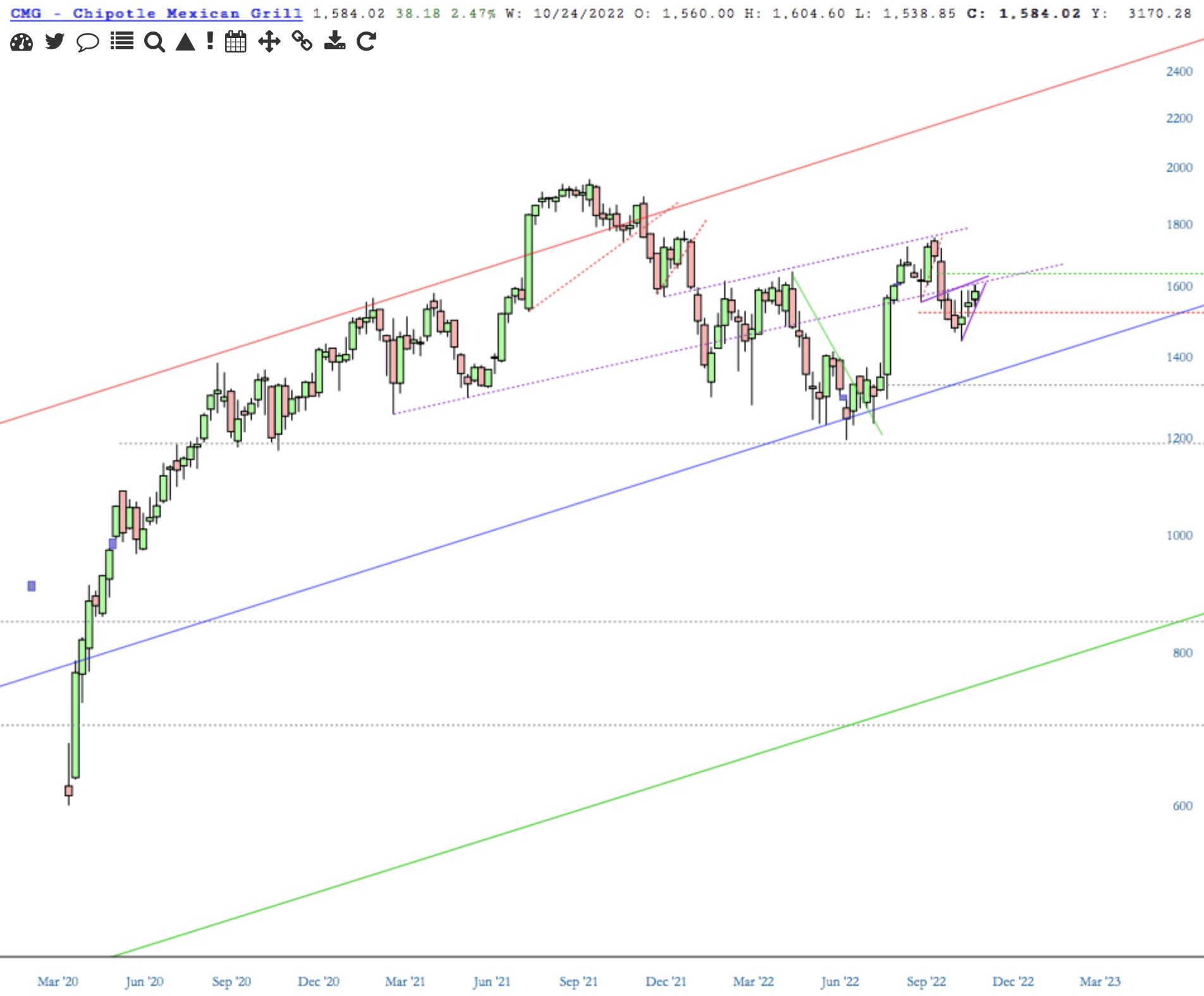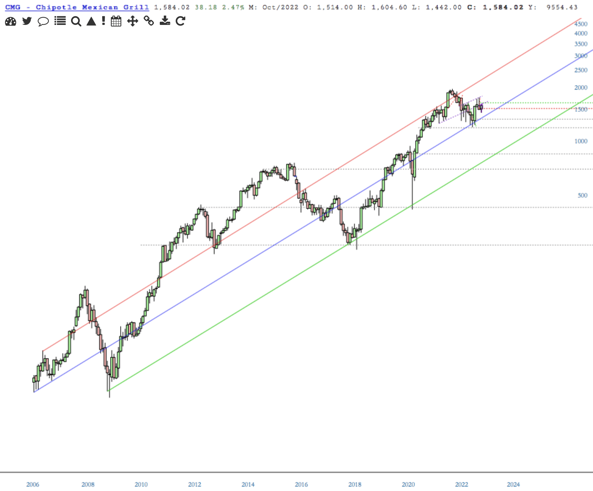 Quarterly and monthly charts of the big burrito [CMG] are green.