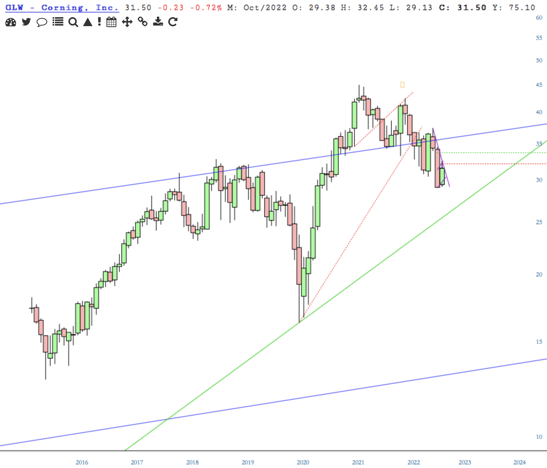 Corning’s quarterly and monthly charts are green, although pressing up against the bottom of the Cbbbloud.