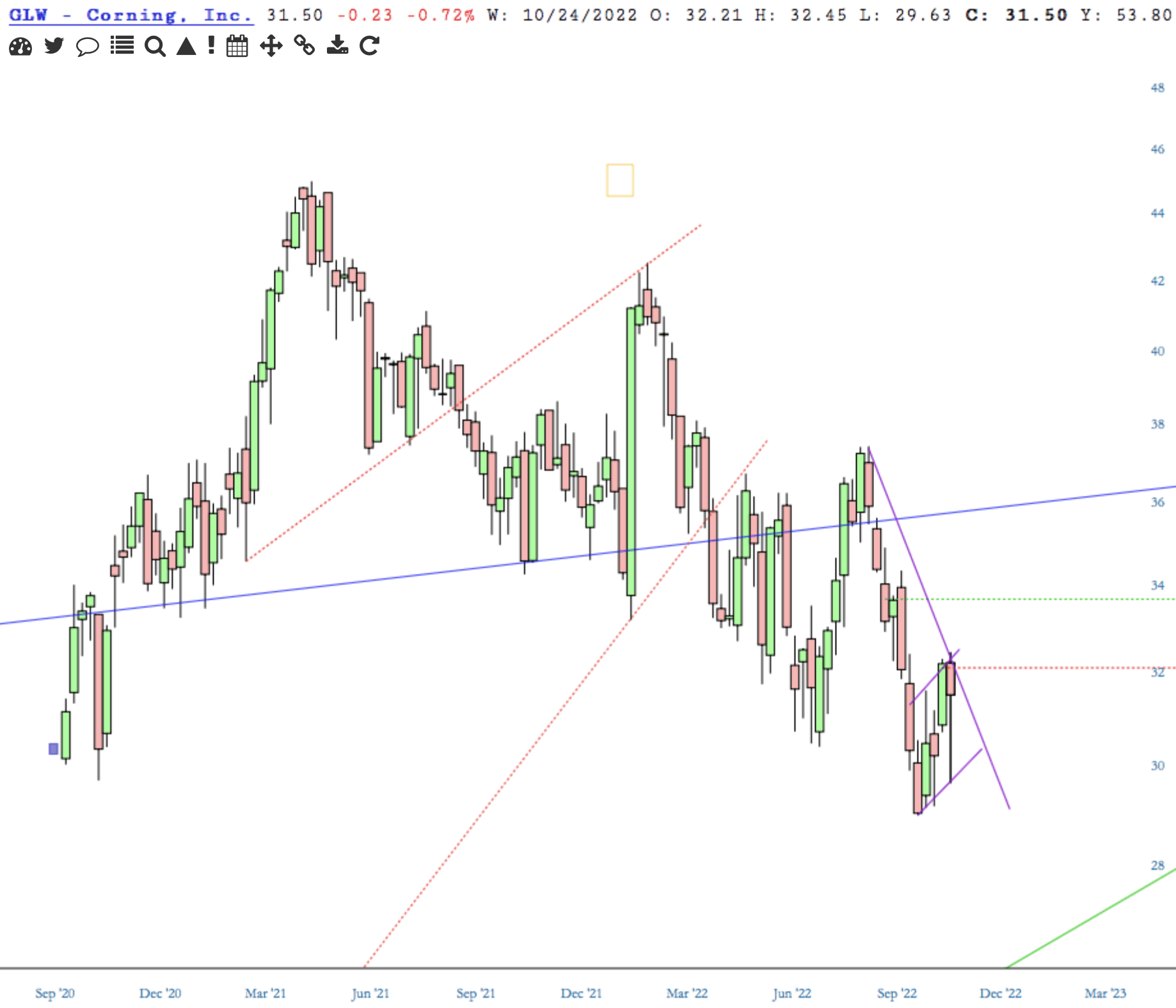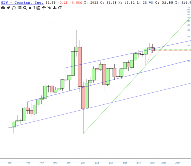 GLW reported earnings yesterday and is on LZ’s 5hit list.  Price topped last year, then lost support of the 1997 channel trendline.