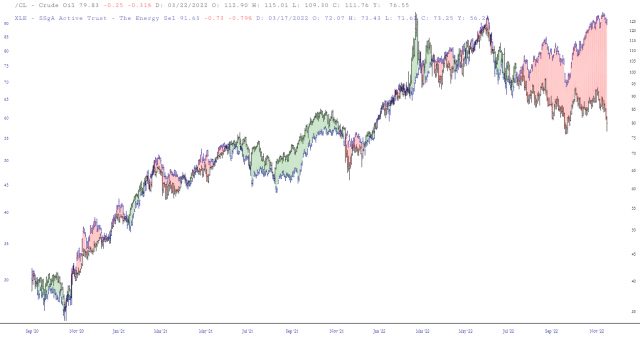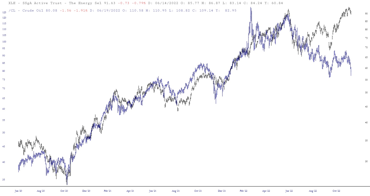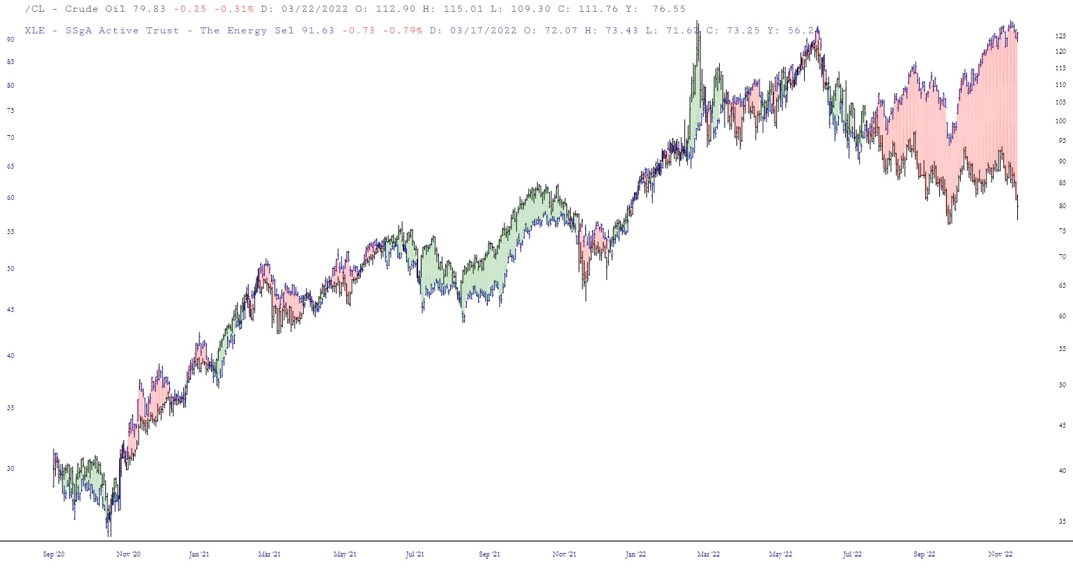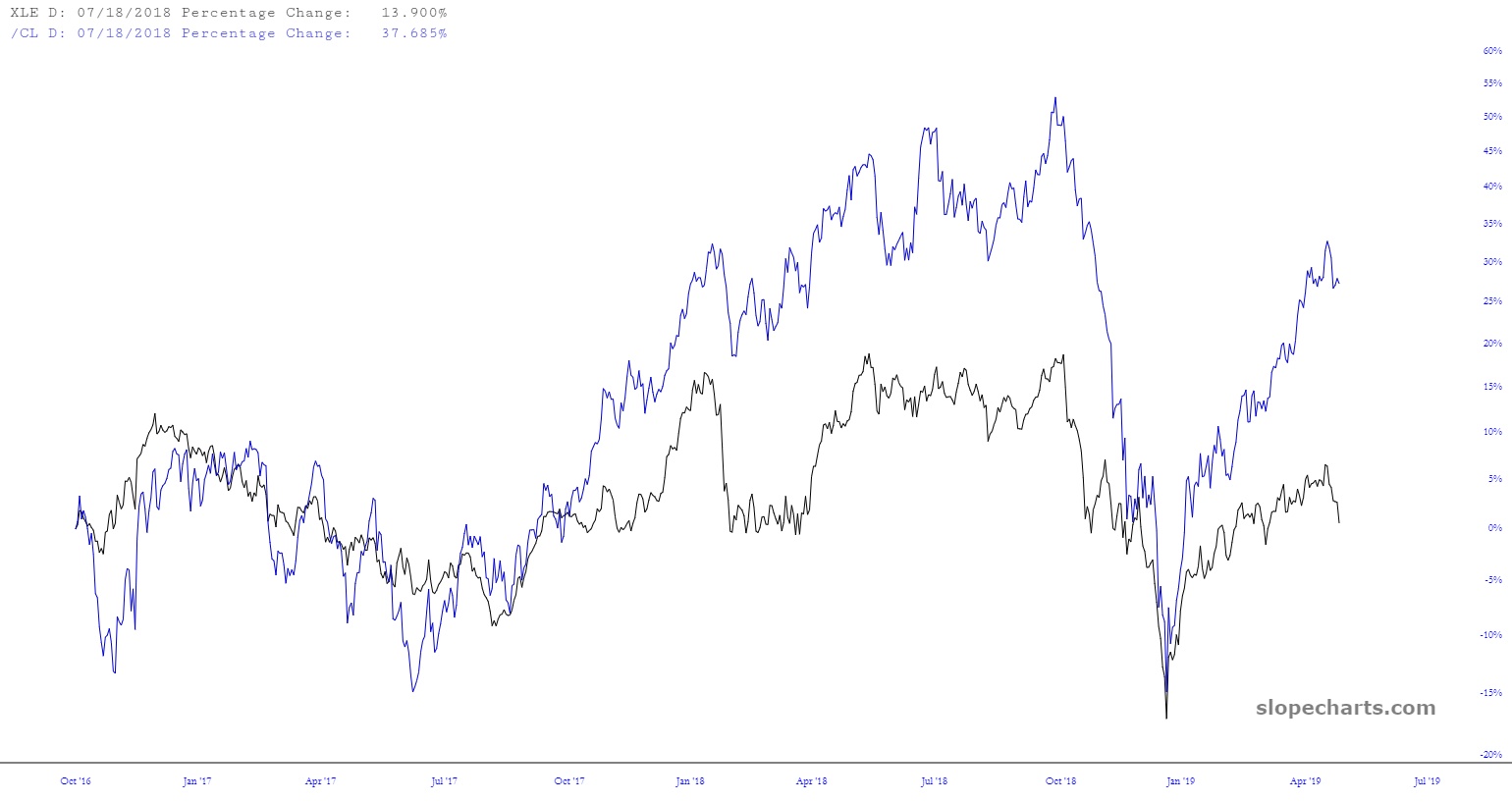 Here are the 2014 and 2018 gaps. In one case CL runs away to the downside and the S&P 500 doesn’t peak until later, in the other XLE catches up amid a broad equities correction