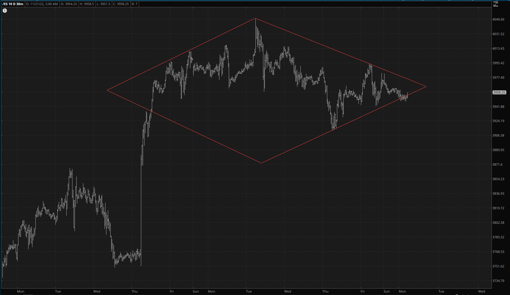 On Saturday afternoon, I had one of my epiphanic charting moments and was immediately gripped with the desire to do a post for my premium members called Third Time’s the Charm. In it, I featured the /ES intraday chart and identified the diamond pattern that I believed was there.