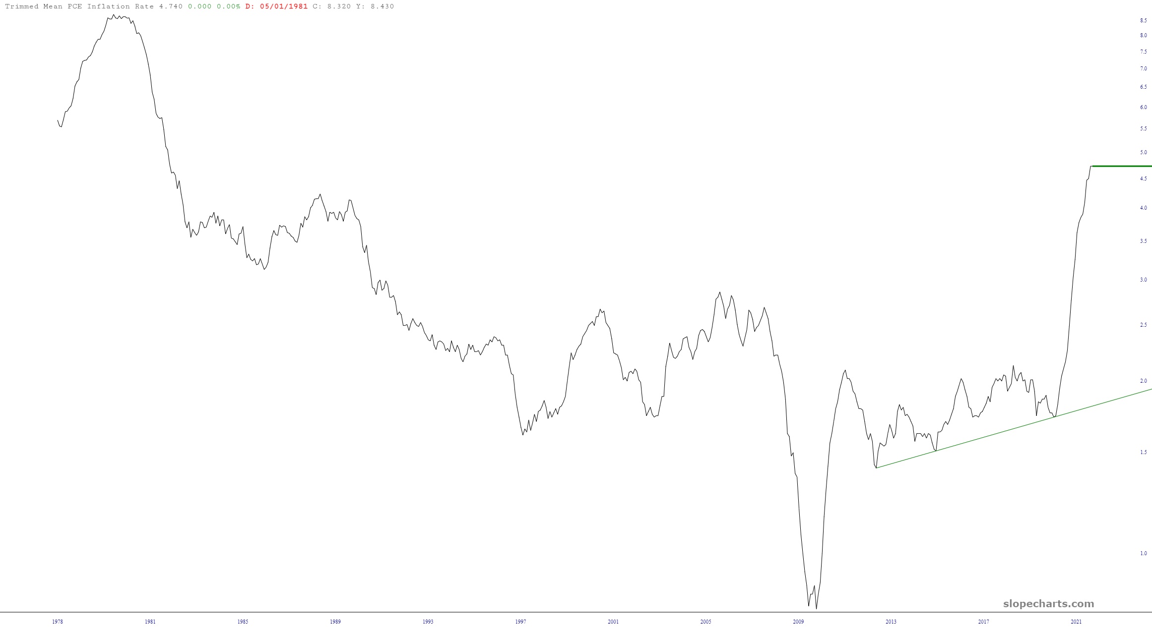 Another item Mr. Stockman mentioned, however, is the Trimmed Mean PCE Inflation Rate, which, to my eyes, seems closer to the truth.
