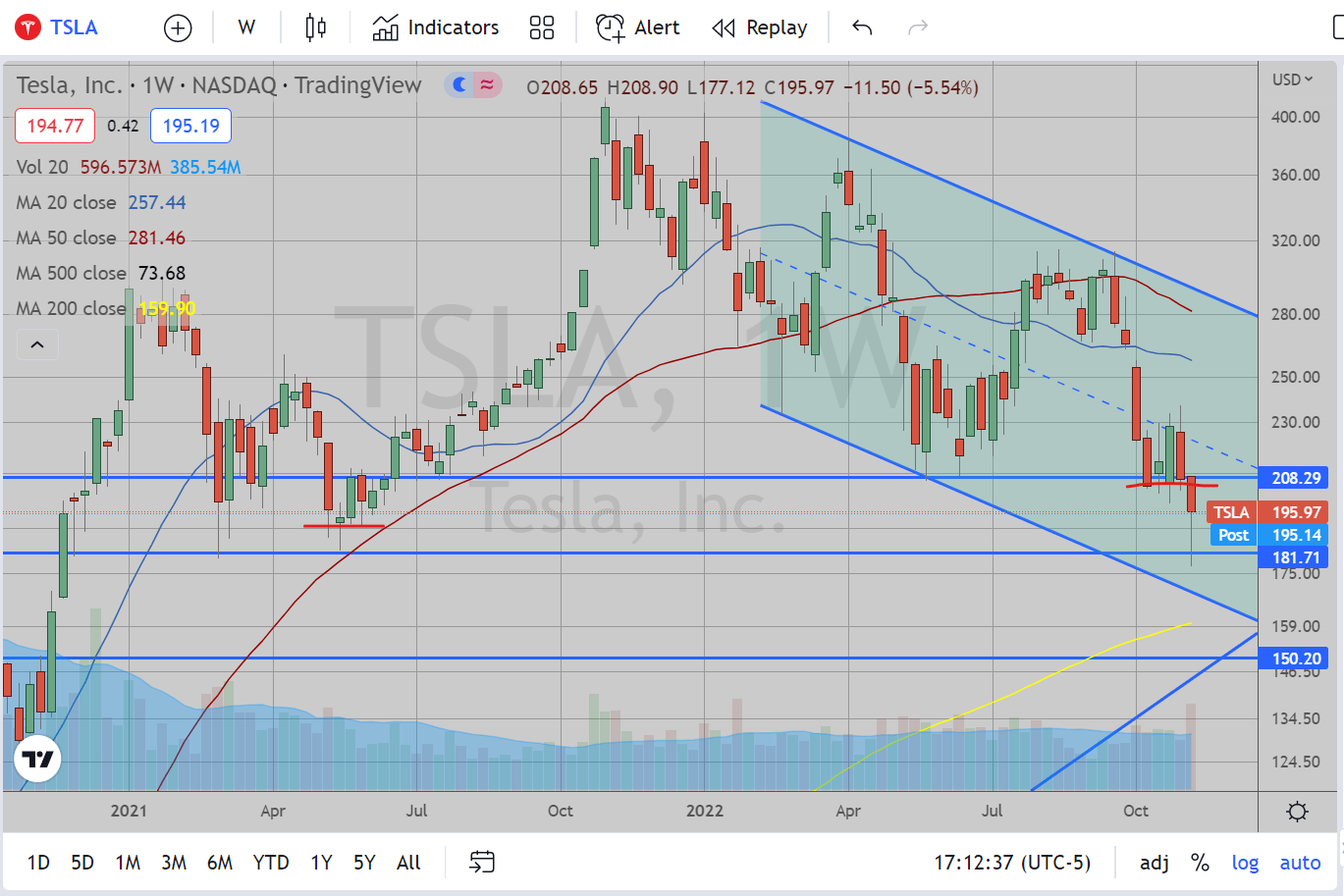 TSLA zoomed out to weekly shows this week has been a nice breakdown beneath the choppiness of the past few weeks. We generated a long wick here but still have not managed to recapture the breakdown zone beneath 208.