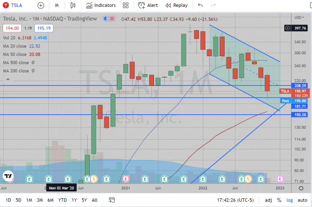 The monthly chart also doesn’t look bullish at all. We just started this month, but I’d expect that 208 level I mentioned to be defended should we trade back up there (i.e., should this get dragged up by the broad market). Closing this month beneath 208 would be the clincher for a continued fall.