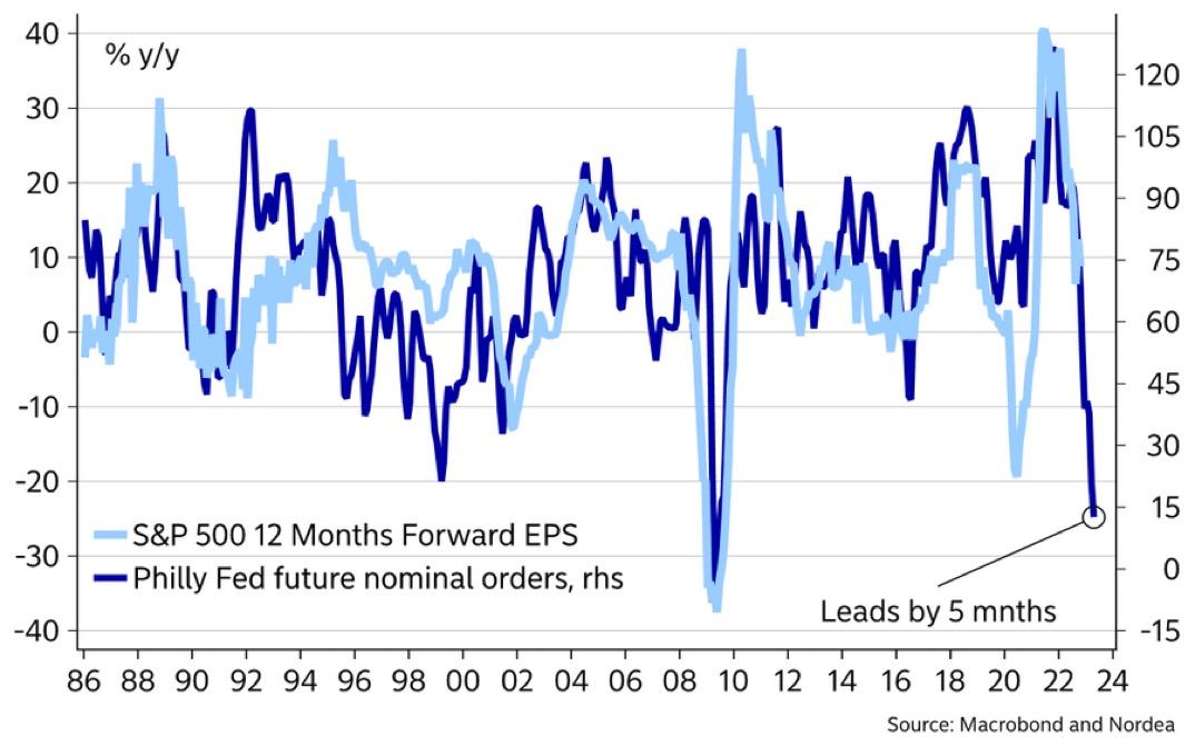 The Director sends me interesting tidbits from time to time, and one item he sent last time pointed out how the Philadelphia Capital Expenditures chart (with the easy-to-remember symbol FR:CEFDFSA066MSFRBPHI) is an excellent predictor of future corporate earnings. Simply stated, stocks are going to get crushed next year as earnings crumble. Booyah!