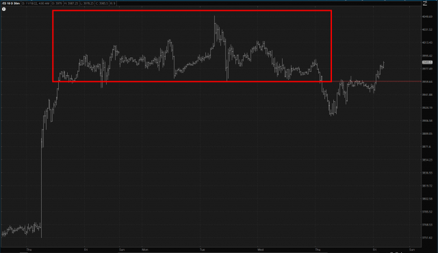 Anyway, I’m sorry to see that equities have strengthened overnight, pushing above what HAD been a tidy little short-term top on the /ES. My “devil may care” purchase of short-term SPY puts enjoyed a quick 30% bump, but instead of making it a quick scalp trade, I held on. Bye-bye, quick profits.