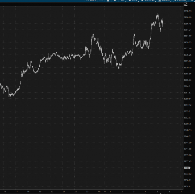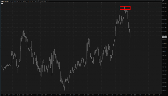 The market was strong yesterday and this morning, so the /NQ went zipping higher, but look at where it turned around (so far, at least) – – almost precisely at the big horizontal.
