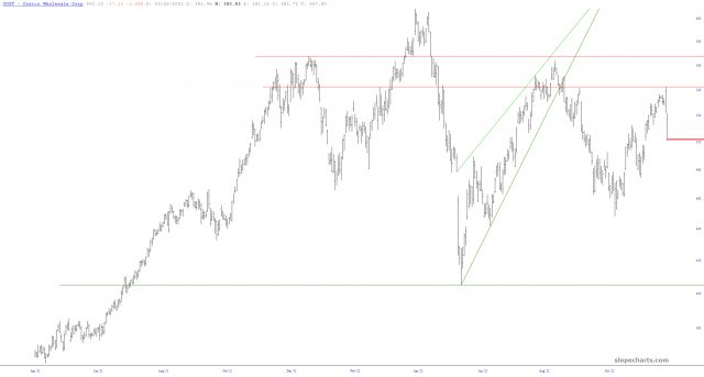 I had puts on Costco (symbol COST). During yesterday’s shotgun-to-the-face nightmare for the bears, for absolutely NO reason other than unchecked panic, I dumped half my position about where the arrow is shown. Well, you know what happened next. I took a loss on what I dumped, and as I glanced at my spreadsheet right now, there is a 60% profit on them (and they have 106 days left on them as well). Just pathetic on my part. At least I didn’t dump 100%, but Jesus, what a ghey-boy.