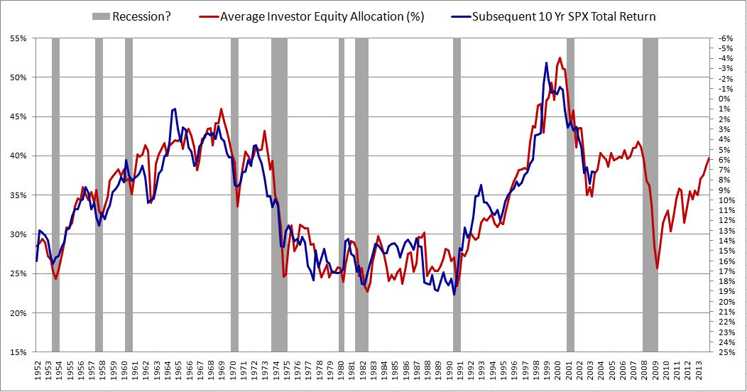The red line is the FRED Asset Allocation plot, while the predicted 10 year returns are shown in blue. They overlay pretty well – they should, the R^2 is over 90%. But those divergences where the lines don’t match hide a lot of sins in future returns. Look at 1993, where the predicted return was 13% but the actual return was about 9%. That’s a 4% annualized shortfall compared to what it should have done – totaling in 10 years a 40%+ miss where the S&P dramatically underperformed expectations.