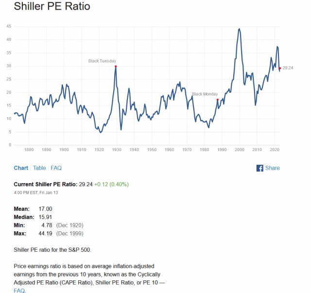 Another valuation method is the Shiller CAPE 10, which stands for Cyclically Adjusted PE Ratio, with a period of 10 years. This metric is cited quite often when claims are made the market is overvalued.