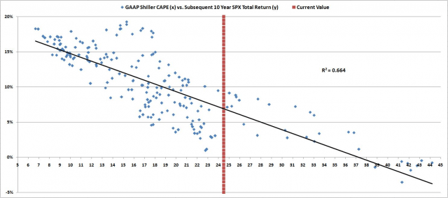 The Philosophical Economics story has a nice plot of the S&P and the regression to the CAPE. Again note that the red line is for 2013, so we’ll need to adjust it to the current 29.24 to find the 10 year potential returns. The author refers to the data fit as “atrocious” but I’ll include it anyway, as it’s so common.