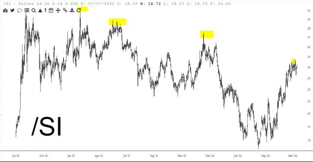 Over the same timeframe, take note of how silver has been losing momentum, even with its powerful upswings. Every high is nothing more than a “lower high”, only to succumb, in the end, to strong selling.