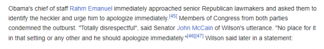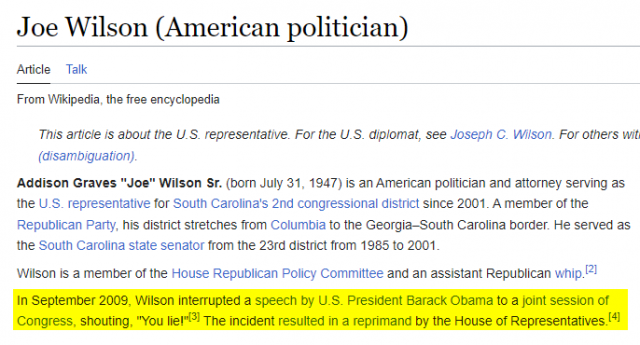 I was instantly reminded that when ONE, count ’em, ONE person shouted ONE thing in Congress at the President 14 years ago, it was front-page news. Indeed, the person in question has a 12 page biography on Wikipedia, but right there at the top in the summary is what he’s best known for doing.
