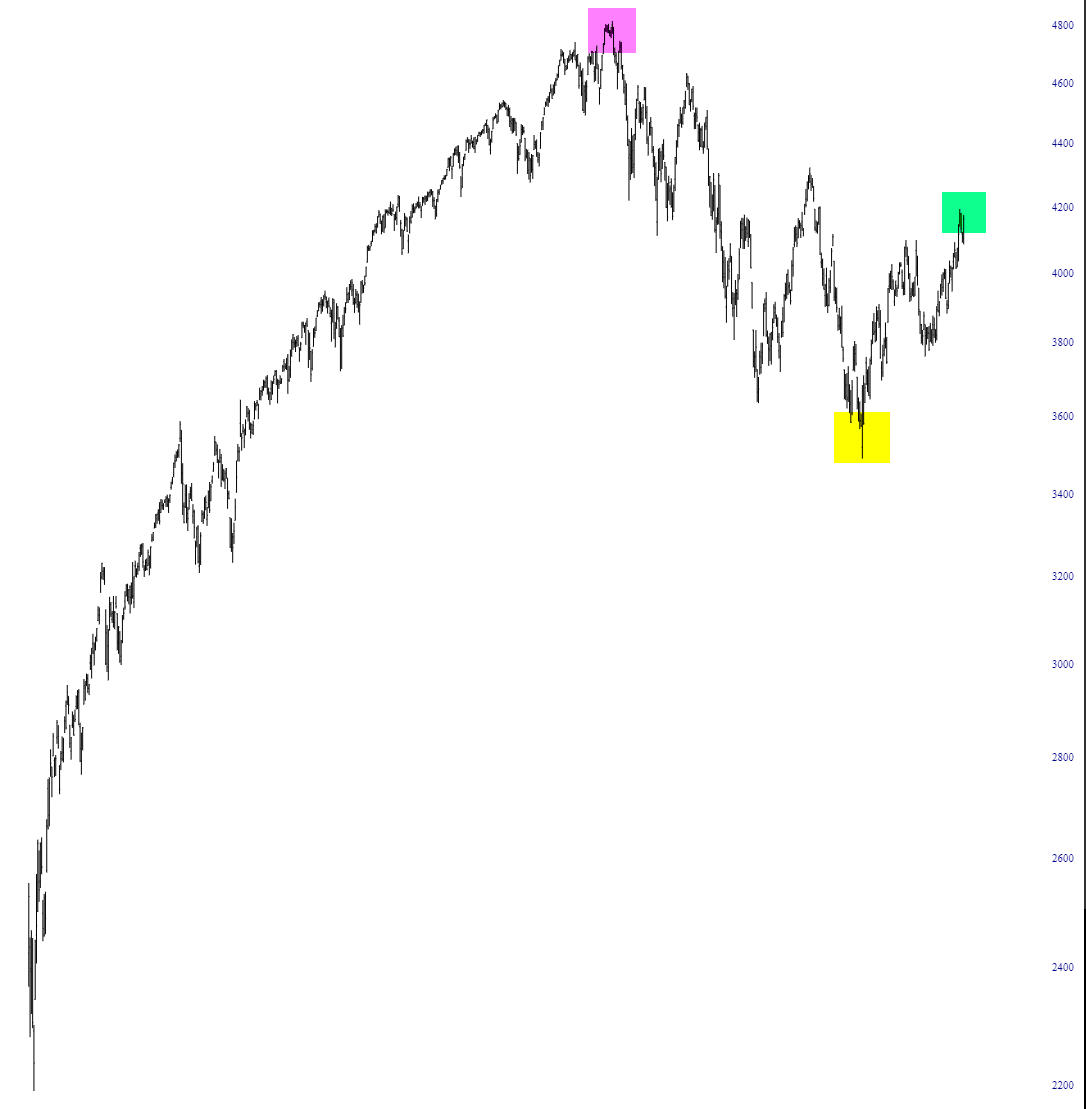 • The virtually uninterrupted ascent from March 2020 until November 2021 corresponds to the Mania Phase shown above, peaking with the New Paradigm (think crypto, NFTs, etc.) and tinted in magenta below;