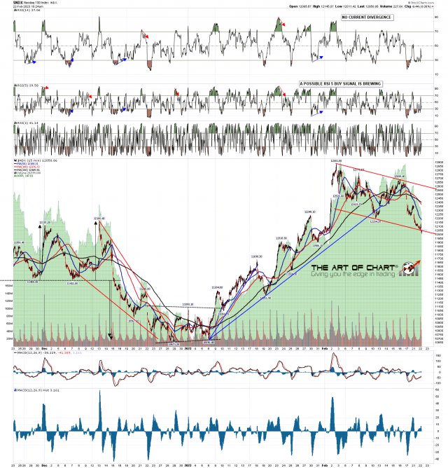 The only support level not yet quite tested is rising wedge support from the 2022 low, and I’m wondering whether that, currently in the 3965 area, might need a test before the rally that we should see here. If we do see a test of that trendline and it holds, then that will open wedge resistance, currently in the 4240 area, as a possible target.