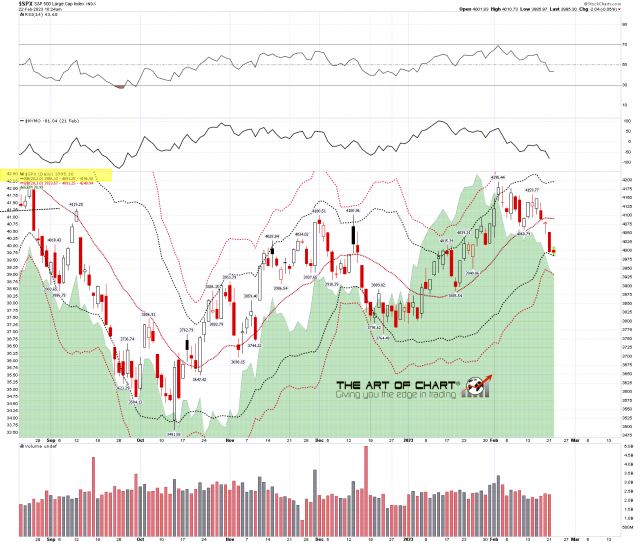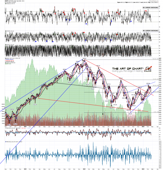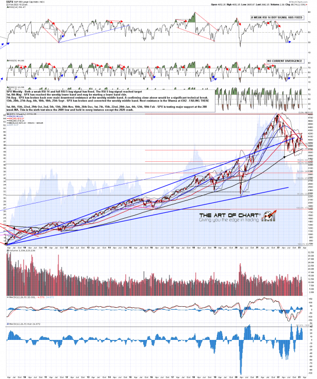 I was talking a lot last year about the 50 week MA, currently in the 4011 area, as key resistance on SPX before it was broken in January. The biggest support level I have been watching on this move down has been that backtest, which is holding well so far. On my bull scenario SPX could start another leg up from this test.