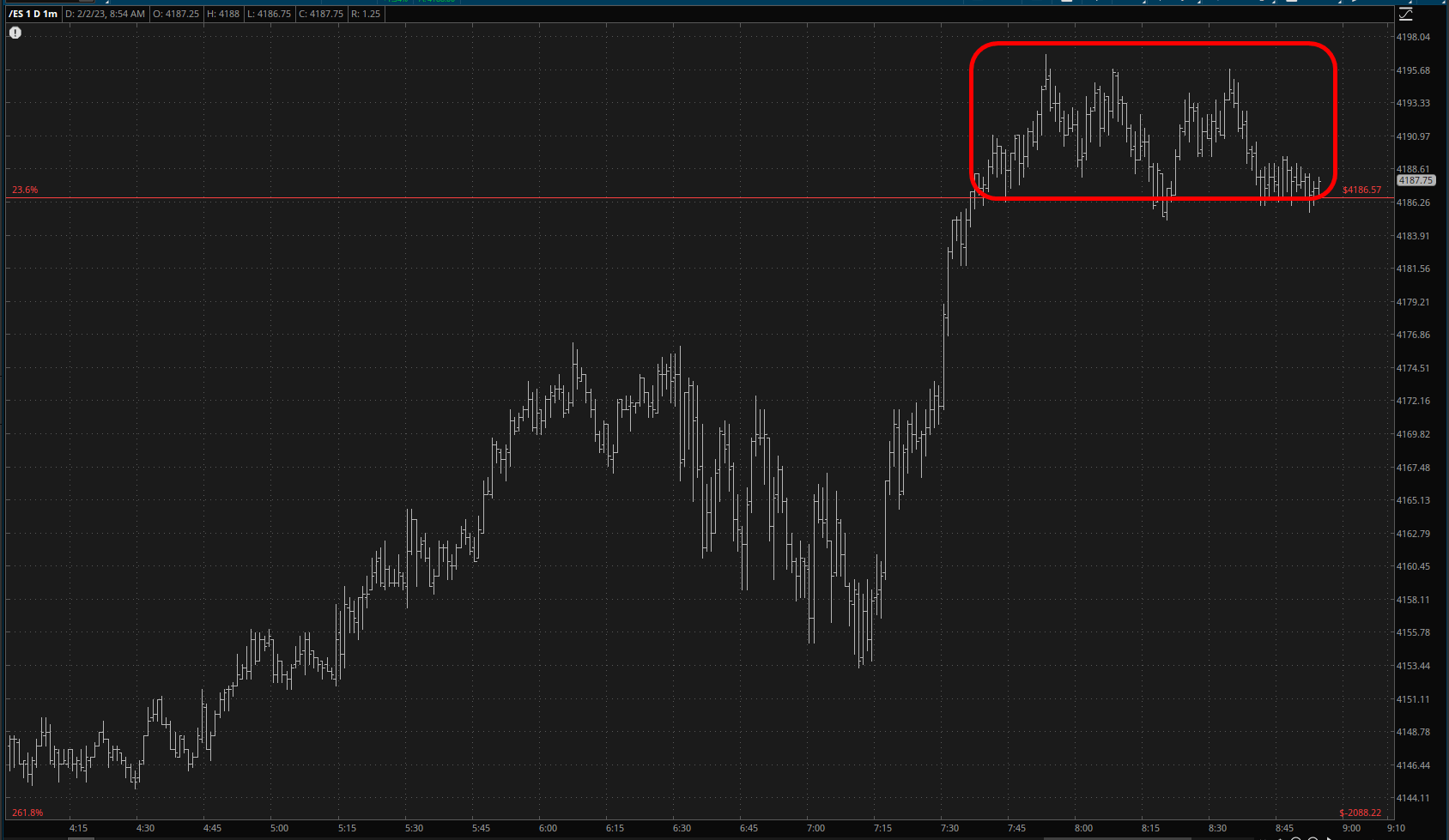 Coincident with this, of course, is the continued strength in the /ES, which was so powerful that we got a “throw-over” (and, for bears, and throw-up-all-over) the Fibonacci level. It’ll be interesting to see if this lasts or not. It’s all up to earnings and jobs at this point, so it’ll be clear within the next 21 hours.