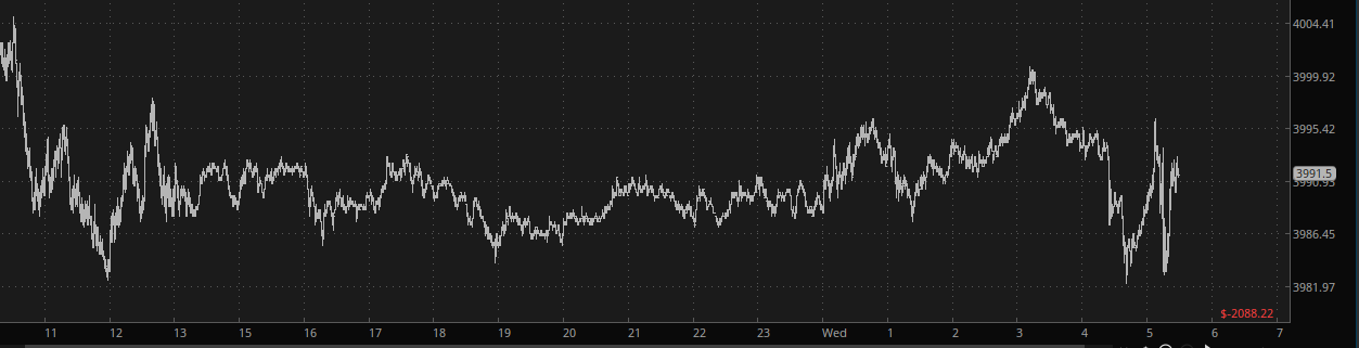 Overnight, there’s none of that tension. The past nine hours, the market has been grinding around in about a 5 point range on the /ES.