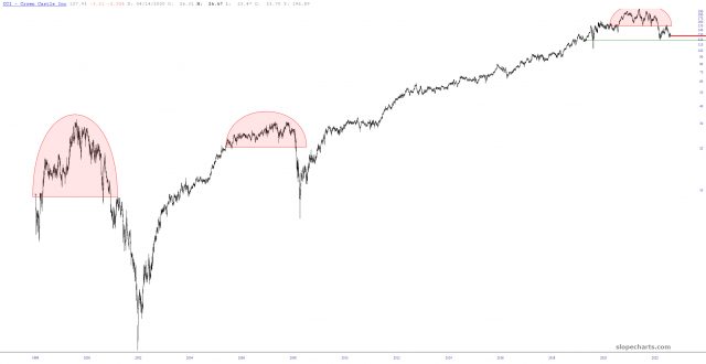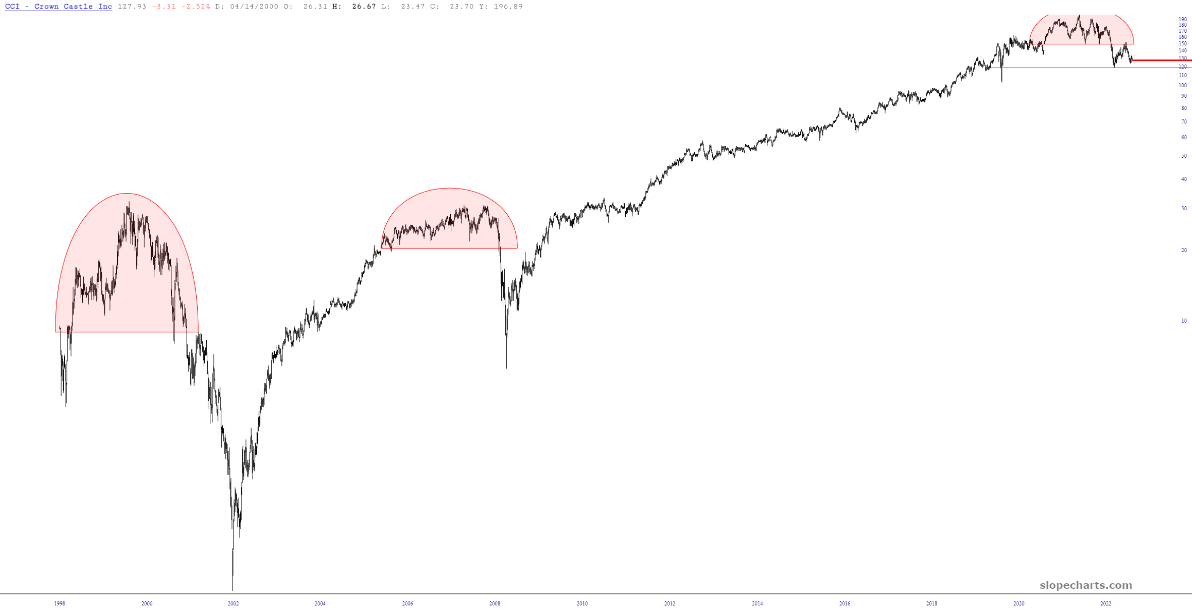 In my portfolio spreadsheet, I always tuck away positions I close so I can see what they do later (I update the data so that the “entry” price is whatever price I got at the exit). Just now, I sorted all these ex-positions by percentage gain, and the biggest ‘one that got away” is Crown Castle (CCI). Looking at the chart, it doesn’t seem that impressive, but the puts I sold on it have gone up an additional 221%.