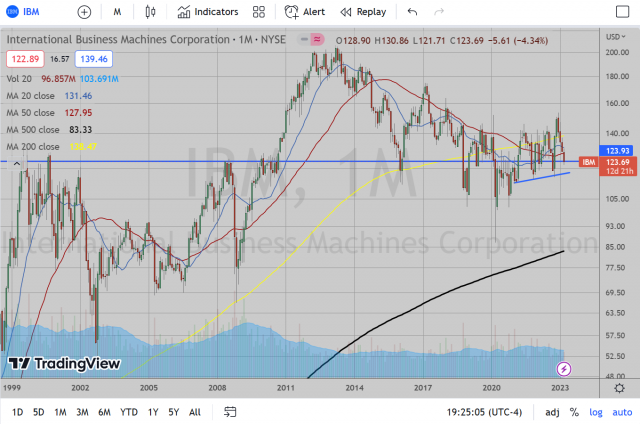 On a monthly we can also see that this stock, while not an AAPL or other growth story, is holding its own in a very choppy sideways motion. Does this mean it is “due” for a pop on a monthly and we’ll get exponential growth? Probably not (unless those AI dreams come to fruition and IBM manages to get ahead of the curve). But it also means it probably doesn’t have much room to drop (again, unless some major news comes out).